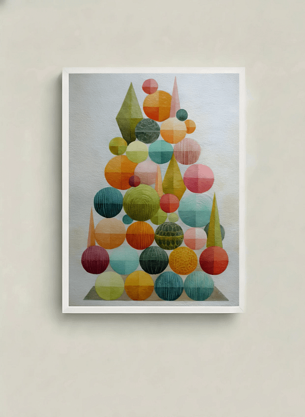 This painting, Geometric Charm, is a watercolor piece brimming with structural beauty and vibrant colors, perfectly embodying the clean lines and sophistication expected of Mid Century Modern Art. The main subject is an abstract Christmas tree formed by stacked geometric shapes, including circles, cones, and rhombuses. These shapes are rendered in a rich yet soft palette of orange, green, blue, pink, yellow, and red, with some spheres featuring striped or grid textures, adding visual interest. A simple white background highlights the geometric forms. This Mid Century Modern Art piece, with its unique composition and color scheme, conveys a distinctive contemporary holiday vibe.