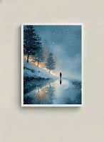 This painting, Crimson Solitude, is a deeply poetic and serene watercolor piece, perfectly capturing the distinctive ambiance of Moody Winter Art. The main subject is a figure in a vivid red coat, standing alone on a snow-covered path, gently enveloped by falling snowflakes. In the background, tall, majestic pine trees in the snow beautifully contrast with the blue and gray backdrop; warm lights emanate from trees lining the path, creating luminous points that reflect mesmerizingly on the cold water. This Moody Winter Art piece, rendered with delicate color gradients and soft light and shadow effects, presents a dreamy and poetic winter scene.