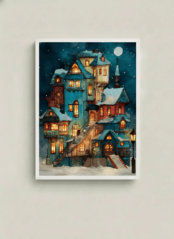 This whimsical watercolor captures a complex cluster of snow-covered, fantasy houses glowing at night. The unique Whimsical Architecture Art is perfect for creating a dreamy holiday setting.