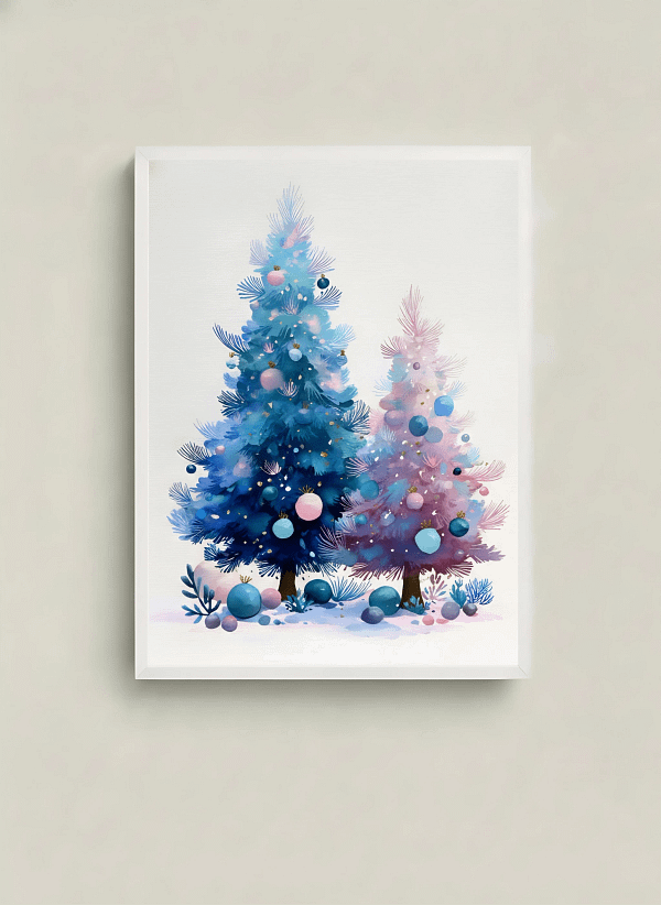 This captivating watercolor features dual-tone pink and blue decorated trees. The perfect Whimsical Christmas Art piece to bring a modern, joyful spirit to your holiday decor.